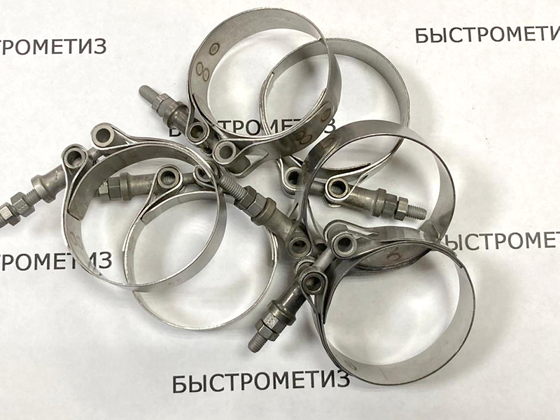 Хомуты ленточные разъемные по ОСТ 1 13448-78 - это специальный крепеж, так как его конструкция заключается в ленте и механизме затяжке представляющим собой болт с резьбой, который при вращении сокращает внутренний диаметр свернутой ленты в кольцо, ими можно соединенять рукава в гидравлических и пневматических системах (топливных, водяных).