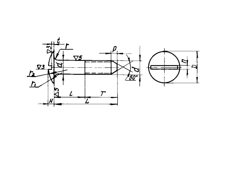 Конструкция болта состоит из головки с прямым шлицем и цилиндрического стержня с резьбой и направляющим конусом.