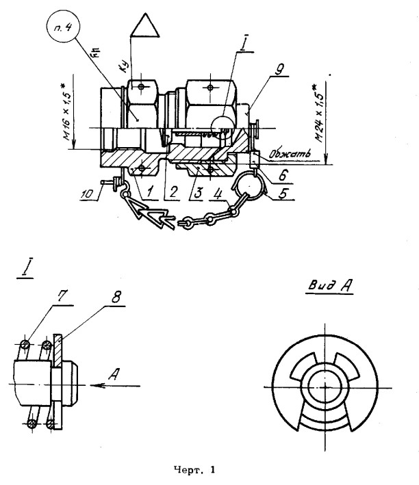 Конструкция штуцера состоит из корпуса, клапана, гайки накидной, цепочки и кольца.