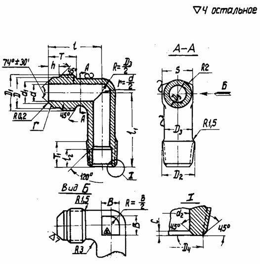 Пример обозначения ввертного угольника к трубопроводу Dу=10 мм длиной l1=30 мм из стали марки 45: