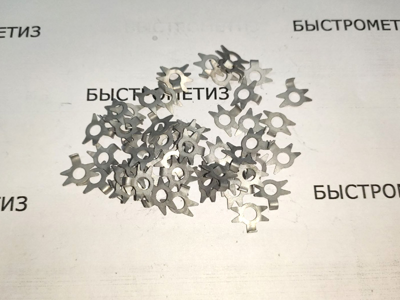 Конструкция шайбы состоит из плоского кольца с прмым лепестком и с двух сторон по два заостренных усика.
